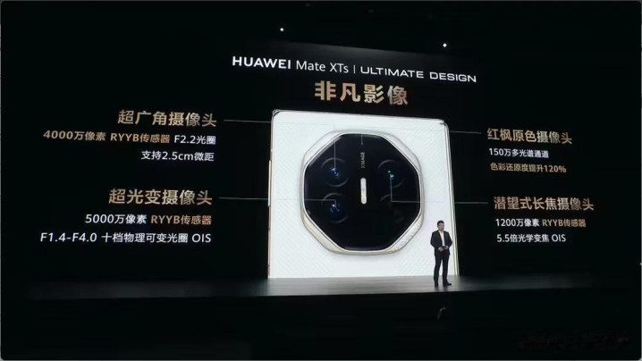华为——“1/1.56英寸+RYYB+OIS+f/1.4-f/4.0可变光圈”主摄+4000万像素超广角镜头+1200万像素RYYB潜望长焦+红枫原色镜头